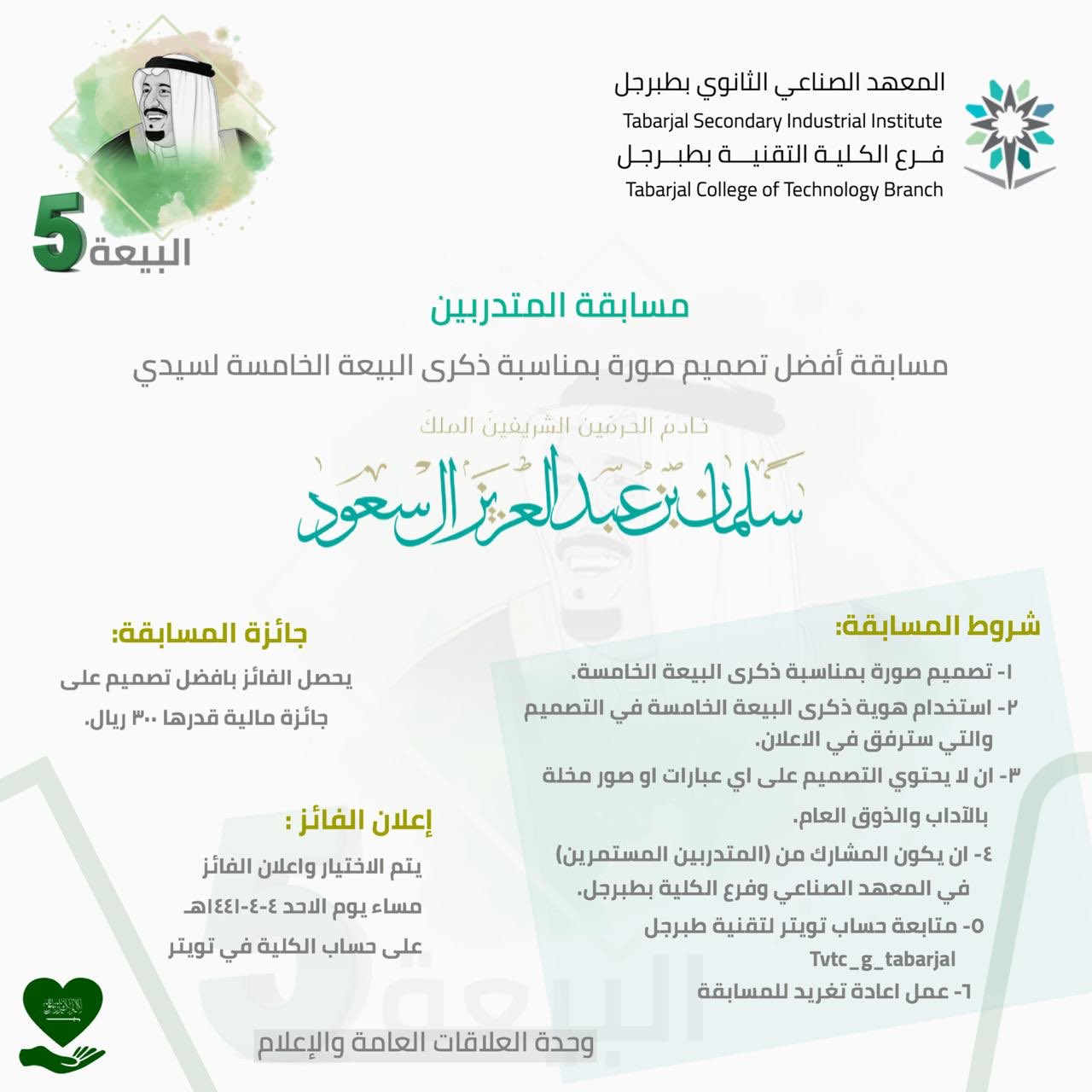 الكلية التقنية للبنين والمعهد الصناعي بطبرجل On Twitter مسابقة شارك في مسابقة افضل تصميم صورة بمناسبة ذكرى البيعة الخامسة لخادم الحرمين الشريفين الملك سلمان بن عبدالعزيز آل سعود حفظه الله للمشاركة اضف تصميمك
